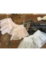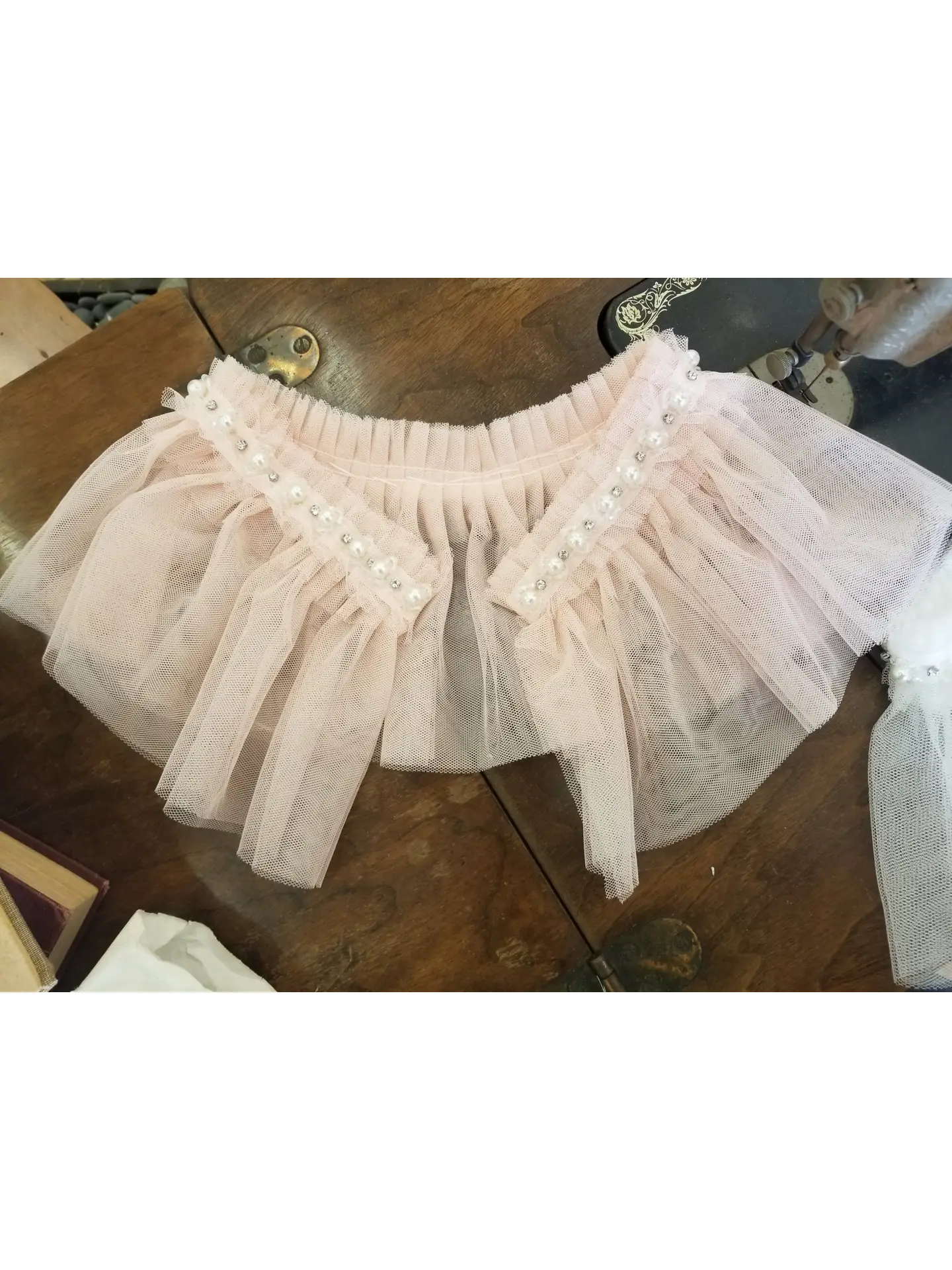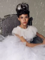 Mesh Cape with Beads and Pearls Gorgeous Ruffle Beaded cape. Cape comes with sewn clasp to close it. Two colors available 19″ (Sizes 2-6 ),  21″ (Sizes 8-12)