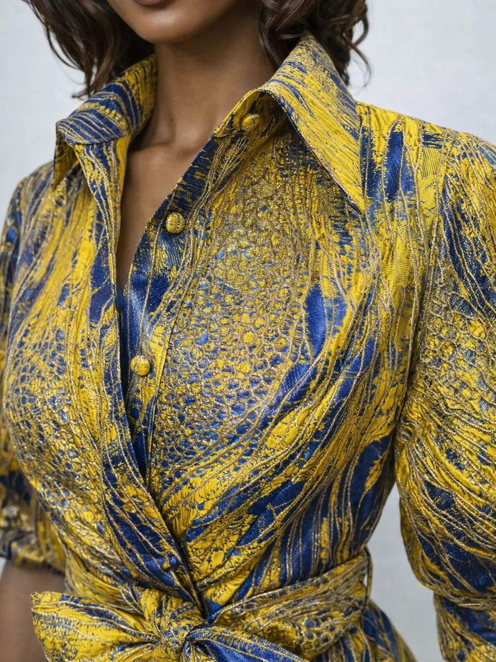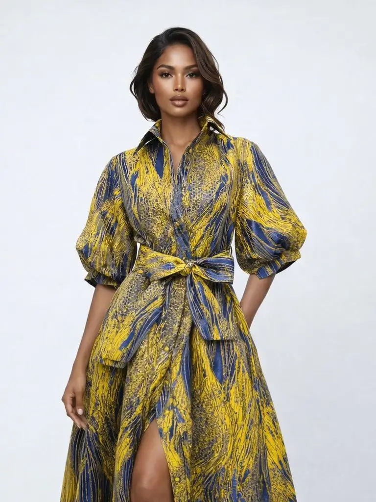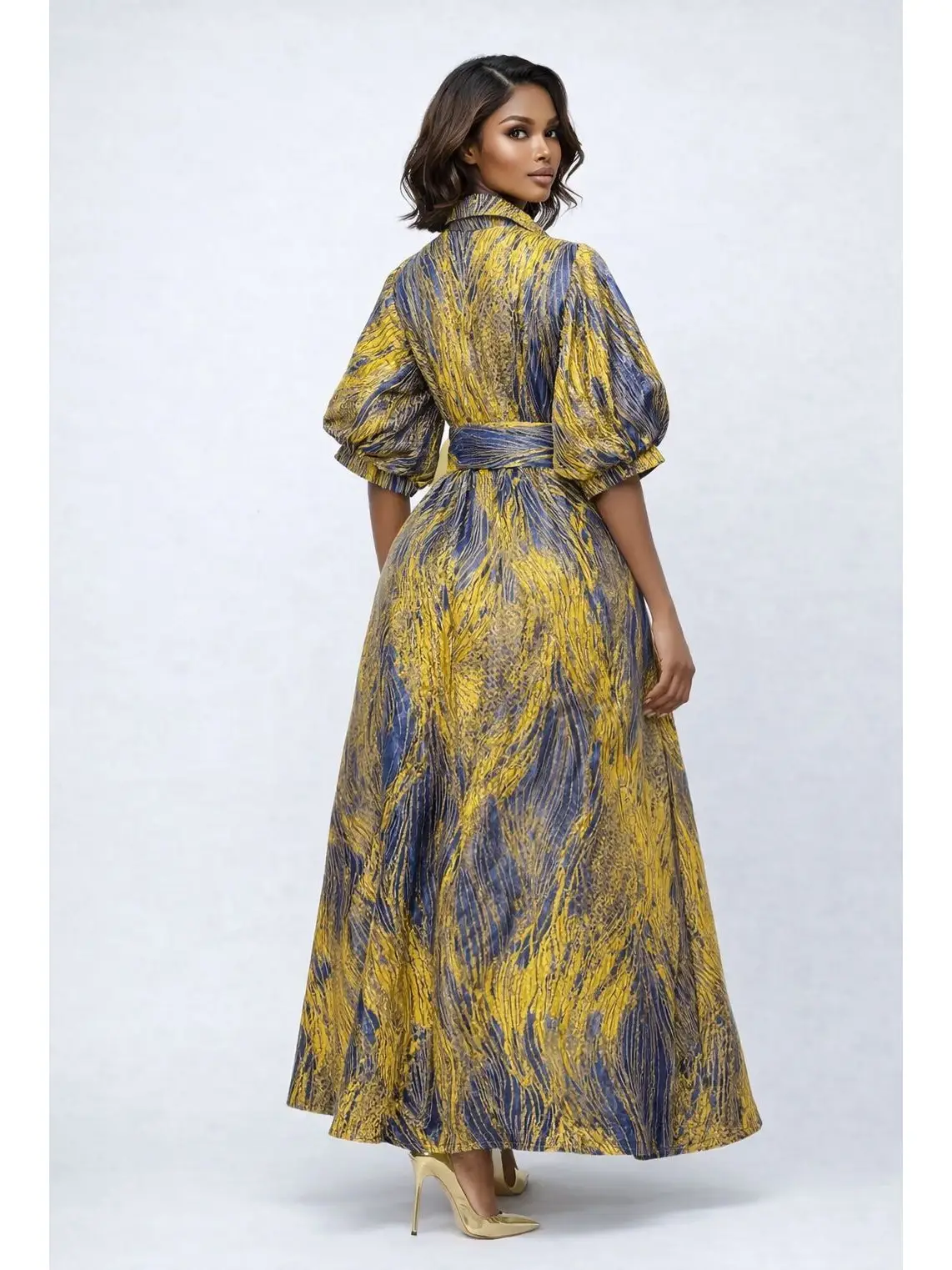 An exclusive brocade Maxi gown accented with gold metallic leaf print detailing. Designed with a textured finish, collared neckline.